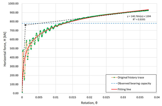 To verify the settings of the numerical model, a centrifuge test of an MBF with a diameter of 5.25 m and a length of 5.1 m conducted by Faizi was taken as an example [14]. During the test, the observed bearing capacity was recorded as 780 kN, with an eccentricity of 14.84 m. We compared the numerically estimated bearing capacity to the observed bearing capacity of the MBF. The original history trace depicted the relationship between the horizontal force and rotation. This relationship was estimated by applying a specific velocity of 1 × 10−7 m/s to the top of the beam elements. The data obtained from the analysis revealed noticeable oscillations due to the velocity-controlled mechanism employed in the simulation. To minimize these oscillations, it is recommended to reduce the magnitude of the applied velocity at the beginning of the simulation. Figure 4 also shows a logarithmic fitting line, which demonstrates an almost linear correlation for small rotations but gradually becomes nonlinear for larger rotations. A methodology to determine the bearing capacity based on this numerical simulation is to estimate the intersection between the linear line at the beginning and the tangent line coincident to the ultimate state. The numerically determined bearing capacity was approximately 760 kN, which was almost identical to the observed bearing capacity of 780 kN found by Faizi.