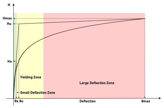 Figure 5 presents a schematic depiction of the load–deflection curve for the MBF. The curve exhibits prominent nonlinearity when the MBF undergoes deformation. Initially, the load–deflection curve develops linearly in a small deflection zone, which signifies that the foundation’s response remains proportional to the applied load. During this phase, the MBF undergoes deflection in a predictable and controllable manner. As the applied load increases, the load–deflection curve departs from linearity into nonlinearity, i.e., the yielding phase. Within this phase, the MBF experiences substantial deflection with marginal increments in the applied load. The ultimate bearing capacity, denoted as , can be determined by estimating the intersection of two tangential lines on the load–deflection curve. These tangential lines are estimated using the initial and final parts of the curve [14,17]. As mentioned, the deflection of the MBF must be optimal to ensure the power generation efficiency of the wind turbine. The permitted bearing capacity, denoted as , is determined based on the permitted deflection, . In most cases of offshore foundations, is in the linear zone of the load–deflection space. In Figure 5, corresponds to the deflection angle, , which indicates the load under which the wind turbine tower would undergo unacceptable deflection beyond the desired limitation.