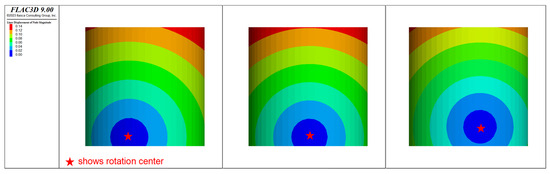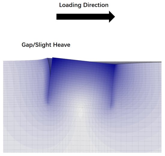 Figure 6 illustrates the deformation characteristics of the MBF under loading. The MBF deformed gradually until reaching an ultimate state, at which point a gap between the soil and bucket skirt formed and a slight heave could be observed. The displacements of the soil were primarily concentrated around the bucket. A rotation center (RC) was located at the center of the MBF bottom. Furthermore, Figure 7 illustrates the deformation characteristics of an MBF under right-pointing loads of 4000 kN, 8000 kN, and 20,000 kN. The MBF was designed with a diameter of 13.0 m and a height of 13.0 m, and the eccentricity level was 10.0 m. It became apparent that the RC of the MBF moved to the upper right when the loads increased. According to Faizi (2020) and Zhu et al. (2011), the depth of the RC in the ultimate state is approximately 0.8 times the length of the skirt, and the RC eventually reaches the skirt on the right-hand side of the MBF [14,25].