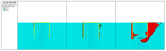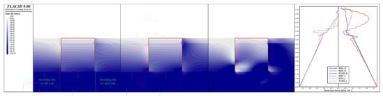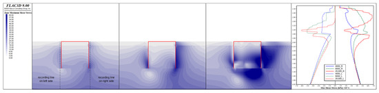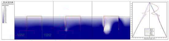 Figure 8, Figure 9 and Figure 10 represent the soil mechanical responses as the MBF was subjected to loads of 4000 kN, 8000 kN, and 20,000 kN, respectively. As the load increased, more of the surrounding soil was mobilized. Notably, when a load of 20,000 kN was applied, the numerical analysis exhibited poor convergence, indicating that the iterative method struggled to reach a stable solution within a reasonable number of iterations. Figure 8 shows the development of horizontal stress as the horizontal loads increased. The horizontal stress on the loading side increased noticeably and that on the anti-loading side decreased gradually. Some of the stress concentration zones around the MBF can be seen in deep blue. The curves of the horizontal stress and the depth estimated under different loads were plotted for both sides of MBF. The solid lines represent the horizontal stress distributions on the right side of the MBF; the dashed lines are for the left side. The blue curve, green curve, and red curve were determined under loads of 4000 kN, 8000 kN, and 20,000 kN, respectively. The horizontal stress above the RC on the right side increased as the loads increased, and the maximum value occurred near the middle above the RC. Below the RC on the right side, the horizontal stress was slightly relaxed. On the left side, the horizontal stress reduced almost to zero when an ultimate load was applied on the MBF. Figure 9 illustrates the vertical stress distribution around the MBF. Similar stress characteristics can be observed in Figure 9. However, a large zero-stress zone at the bottom built up, causing the MBF to have a low bearing capacity. Figure 10 shows the development of the shear stress due to the loads. A wedge-shaped area of concentrated stress developed on the right side and at the bottom of the MBF. The soil around the RC was less disturbed. Figure 11 shows plastic zones of soil for the mono-bucket foundation under various loads of 4000 kN, 8000 kN, and 20,000 kN, respectively. The soil began yielding on the anti-loading side but built up mostly on the loading side. The plastic zone in the ultimate state was highly coincident with the wedge-shaped area of concentrated shear stress.