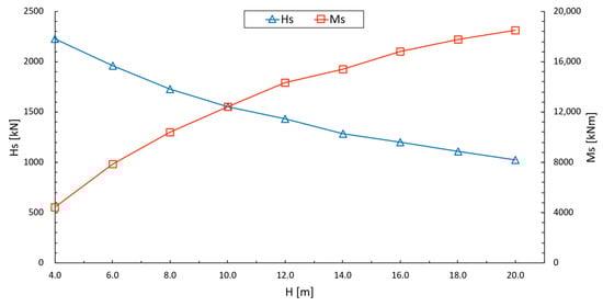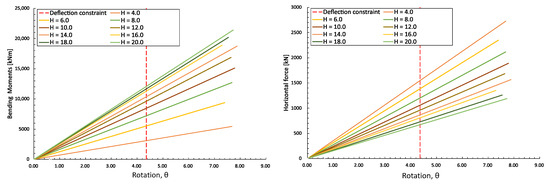Based on the simulation results, the effects of the aspect ratio, the loading eccentricity, and the vertical loads on the bearing capacity are demonstrated in Figure 12, Figure 13, Figure 14 and Figure 15. In Figure 12, several linear bending moments/horizontal force–deflection curves are presented considering different loading eccentricities. The local numerical oscillations were eliminated in the small deflection zone. The permitted bearing capacity was determined at a deflection constraint of 4.36‰. Figure 13 demonstrates the effect of the eccentricity on the permitted bending moment and horizontal force for an MBF with and . The permitted bending moment increased as H increased. However, the MBF could bear a smaller horizontal force when the eccentricity increased. Recognizing this is very crucial in the design of an MBF. Figure 14 illustrates the changes in the permitted bending moments as the aspect ratio increased for an MBF with H = 4 m and . A wide and short MBF exhibited a lower bearing capacity than a thin and deep MBF, since thin and deep MBFs can mobilize a greater (wedge-shaped) area of soil on the loading side compared to the anti-loading side. Figure 15 illustrates the effect of vertical loads on the permitted bending moments for an MBF with . It can be observed that the vertical loads had few effects on the permitted bearing capacity, though a slight increase occurred as the vertical loads switched from compressive to tensile. We had expected the MBF to stay elastic in a small deflection zone and some of the surrounding soil to deform plastically.