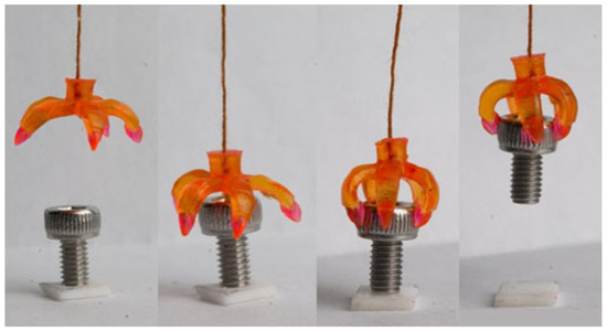 Three-dimensional printed multi-material grippers. Time-lapsed snapshots of the gripper performing an object-grabbing action. Source: Adapted from Ge et al., 2016, Scientific Reports, under open-access license (CC BY 4.0) [56].