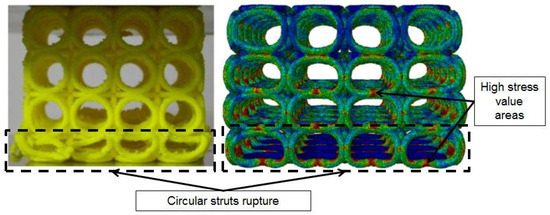 Experimental and FEM generated scaffold snapshots with failure pattern and high stress value areas highlighted [131,132].