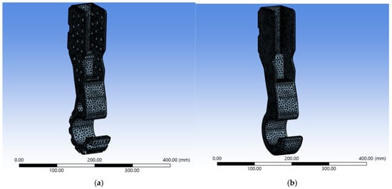 The same boundary conditions were used on both models. A fixed support was applied on the inside of the socket of both models, and the load was applied on the point of the footpad which contacted the ground as shown in