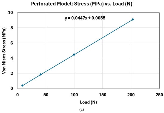 Figure 6b. This discrepancy is primarily attributed to differences in geometry and structural integrity. The Perforated Model includes design features such as holes and grooves, which significantly reduce its effective cross-sectional area. With less material available to distribute the applied load, stress is concentrated in the remaining structure, particularly around the geometric discontinuities. In contrast, the Solid Model retains a uniform cross-section, which allows for more even load distribution and better structural stiffness. As a result, it experiences lower stress under identical loading conditions. These findings underscore the impact of geometric design on mechanical performance, especially in components subjected to increasing loads. The presence of perforations weakens the structure’s ability to withstand stress, making it more susceptible to failure if not properly accounted for in design. Higher stress concentrations are more likely to occur in the thinner sections of the Perforated Model, as these areas are less capable of distributing the applied load evenly. This phenomenon is clearly visible in