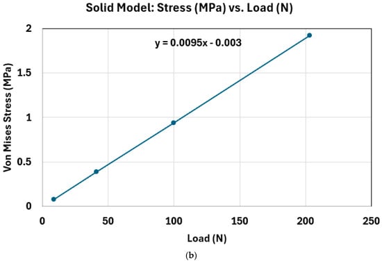 Figure 6 illustrates a clear trend: as the applied load increases on both models, the equivalent (von Mises) stress increases correspondingly, demonstrating a direct and nearly linear relationship between load and stress. However, what stands out in the comparison between