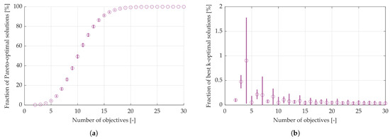 Besides the dimensionality of the design space, challenges in the optimisation of complex mechanical systems also arise from the need to consider a large number of objective functions. As this number increases, the fraction of non-dominated entries within the solutions set increases rapidly [41,42], making the Pareto optimality criterion alone insufficient to select a preferred design. To address this issue, Levi et al. proposed the concepts of k-optimality [43] and -optimality [44], which enable a further ranking among Pareto-optimal solutions.