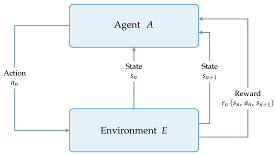 This section outlines the general framework of Reinforcement Learning (RL) and its adaptation to the context of multi-objective optimisation. Reinforcement Learning is an approach used to improve the performance of an artificial machine that interacts, performing some actions, with an environment. The core of RL lies in the feedback information passed through the reward function, a scalar function that measures the goodness of the new state of the environment after the machine perturbed it with its action. The artificial machine establishes the action to perform according to an inner policy that uses the state of the environment as information. The reward feedback mechanism constantly informs the machine on how good its past actions were. A training algorithm updates the policy of the machine to maximise the expected future rewards, that is, the rewards that the machine expects to receive for future actions. Figure 2 shows the general framework for RL, in which n is a generic step within the evolution of the environment E. The environment, described by its state , is perturbed by the action and reaches the state because of it. Agent A is rewarded with the scalar function , which is a judgment, in numerical terms, of the performed action. Then, the policy of the agent is updated using an internal training algorithm that aims to maximise the expected reward of future actions.