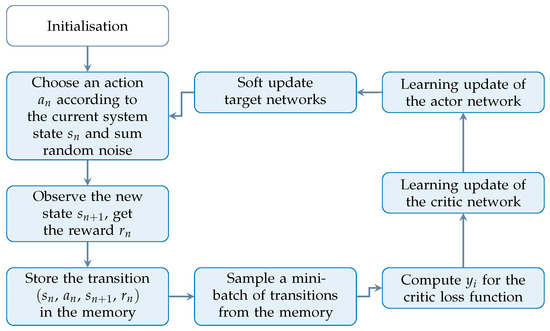 The Deep Deterministic Policy Gradient (DDPG) is a model-free, off-policy, actor–critic algorithm that exploits deep neural networks to learn control strategies in high-dimensional, continuous action domains. This means that the DDPG operates without a predefined model of the environment (model-free), learns a target policy different from the one used to generate behaviour of the actor (off-policy), and relies on the interplay between two neural networks typically referred to as the actor and the critic. The DDPG combines ideas the from Deep Q-learning method [27], which is restricted to discrete action spaces, and the Deterministic Policy Gradient (DPG) method [20], which performs well generally but struggles with more complex control challenges. A summary of the algorithmic flow of the DDPG is presented in Figure 3.