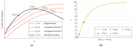 Objective function evaluation procedure based on multi-body simulation output curves. (a): Generic simulation output, acceptance bounds, and target. The horizontal axis x is the independent variable of the simulation. (b): Trend of , as a function of the distance between the multi-body output curve and the target. Circles in (a), representing generic multi-body simulation outputs , are mapped into values in (b). The objective function value associated to the given simulation output is the arithmetic mean of all .