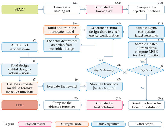 The complete workflow of the MORL–DB method is summarised in Figure 5 and consists of the phases listed below. The initial stage of surrogate model training–phases (A1)–(A4)–and the final validation stage–phases (B1)–(B3)–can be omitted when the optimisation is carried out directly on the physical model: