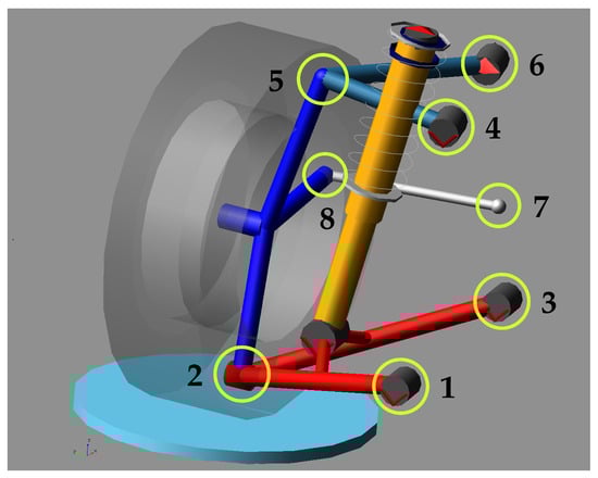 - Avi, A.G.; Carboni, A.P.; Costa, P.H.S. Multi-objective optimization of the kinematic behaviour in double wishbone suspension systems using genetic algorithm. In Proceedings of the 2020 SAE Brasil Congress & Exhibition, Sao Paulo, Brasil, 1 December 2020. SAE Technical Paper 2020-36-0154. [Google Scholar] [CrossRef]