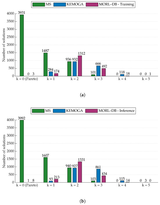 To overcome this limitation, Levi et al. [43] propose the concept of k-optimality to rank Pareto-optimal solutions. Given the MOP of Equation (1), a solution is k-optimal if it is Pareto-optimal for any subset of objective functions. It follows that the optimality level k of a solution can vary from 0, for a simple Pareto-optimal solution, to for a solution that optimises all the objective functions of the problem. This latter case is the Utopia solution, which cannot be achieved in any well-posed MOP.