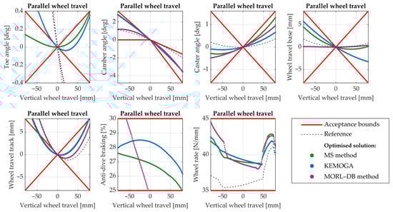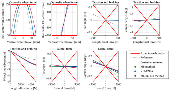 A proof of the effectiveness of the MORL–DB method has already been discussed by De Santanna et al. [45], who applied the algorithm to the optimisation of the elasto-kinematic behaviour of a MacPherson suspension system. In the present work, the MORL–DB method was applied to the optimal elasto-kinematic design of a double wishbone suspension system, modelled as a multi-body system in the ADAMS Car suite. The optimisation problem involves 30 design variables, including the coordinates of 8 suspension hard points and 6 scaling factors acting on the elastic characteristics of 2 of the suspension’s rubber bushings. These variables are constrained by the available three-dimensional design space for the hard point locations and by upper and lower bounds on the scaling factors. A total of 14 objective functions are considered.