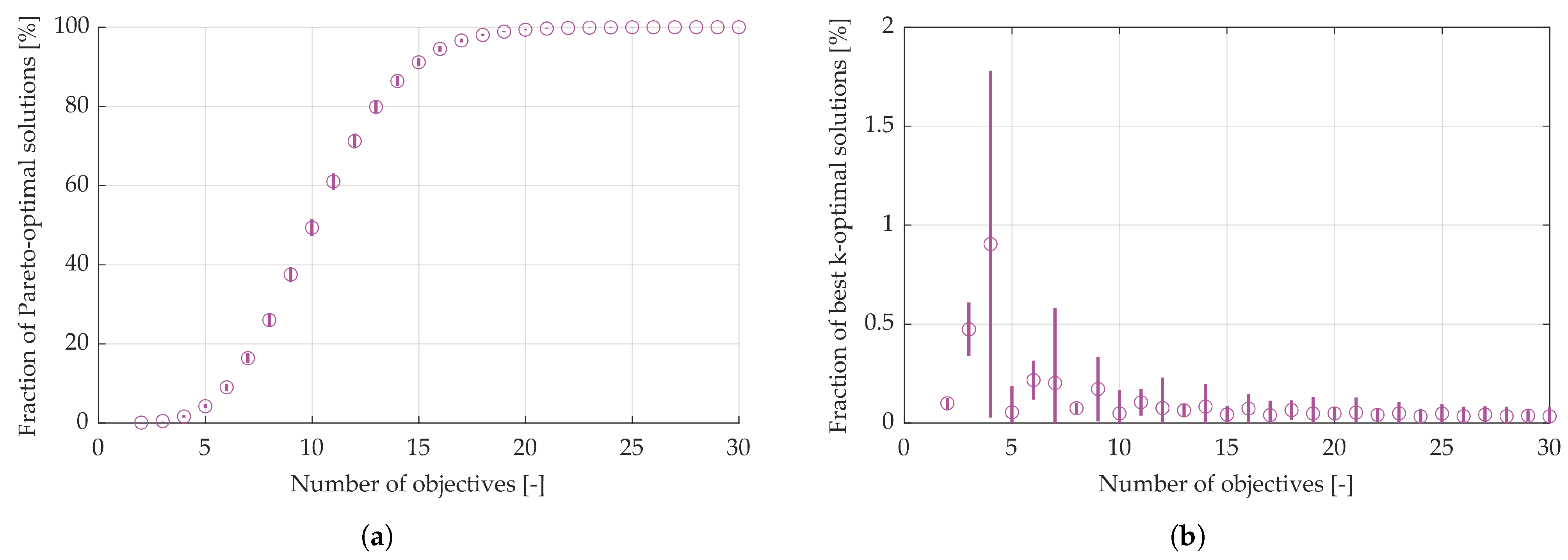 Besides the dimensionality of the design space, challenges in the optimisation of complex mechanical systems also arise from the need to consider a large number of objective functions. As this number increases, the fraction of non-dominated entries within the solutions set increases rapidly [
