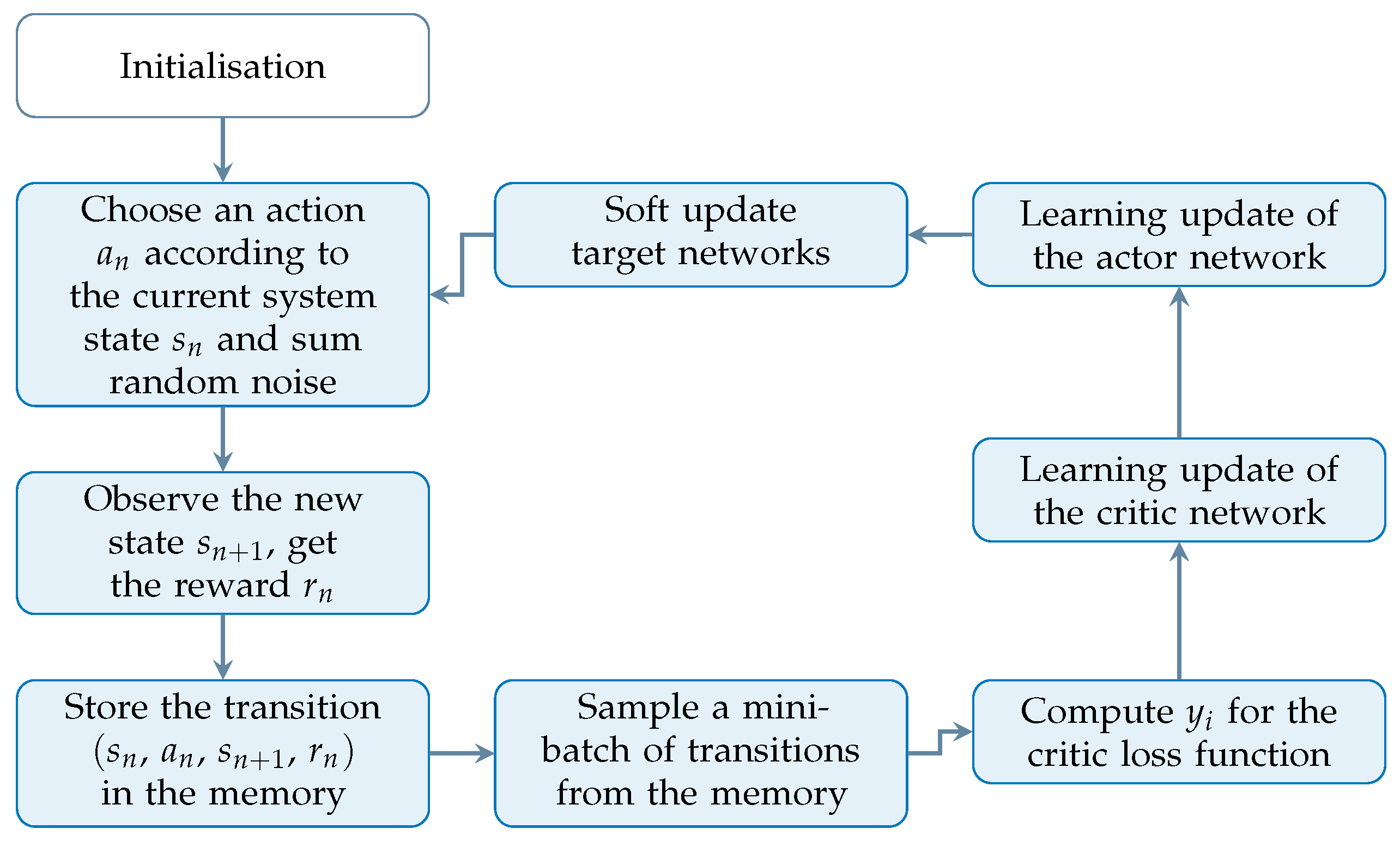 Here, N denotes the number of future steps considered, and is a discount factor that adjusts the weight of future rewards. The objective in the DDPG is to derive an optimal deterministic policy that maximises the expected return from each state .