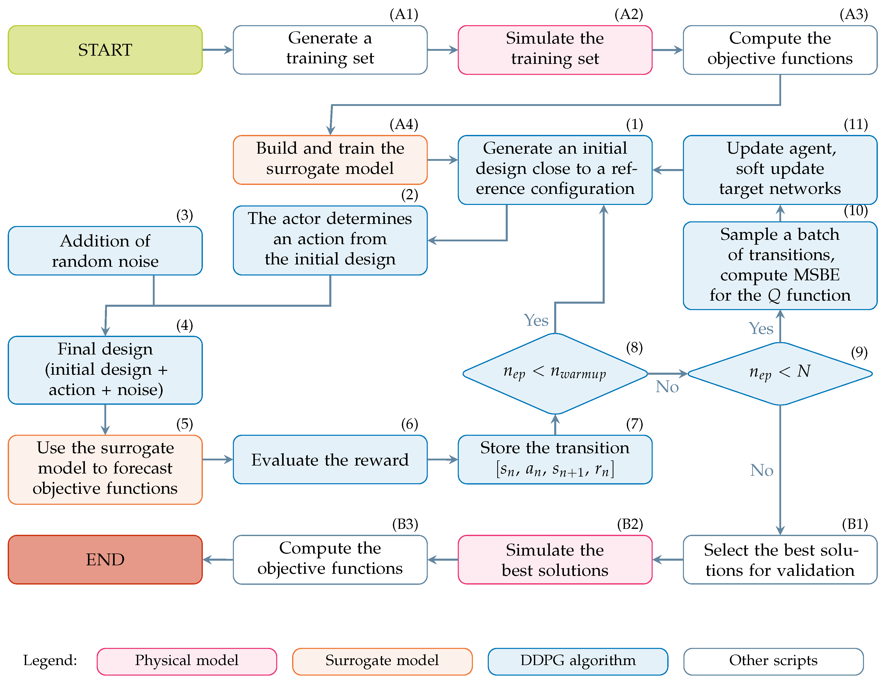 Finally, it is worth noting that, at the end of the training, the agent has an in-built knowledge of the state transition, enabling it to move from configurations in the neighbourhood of a reference design toward optimal configuration [