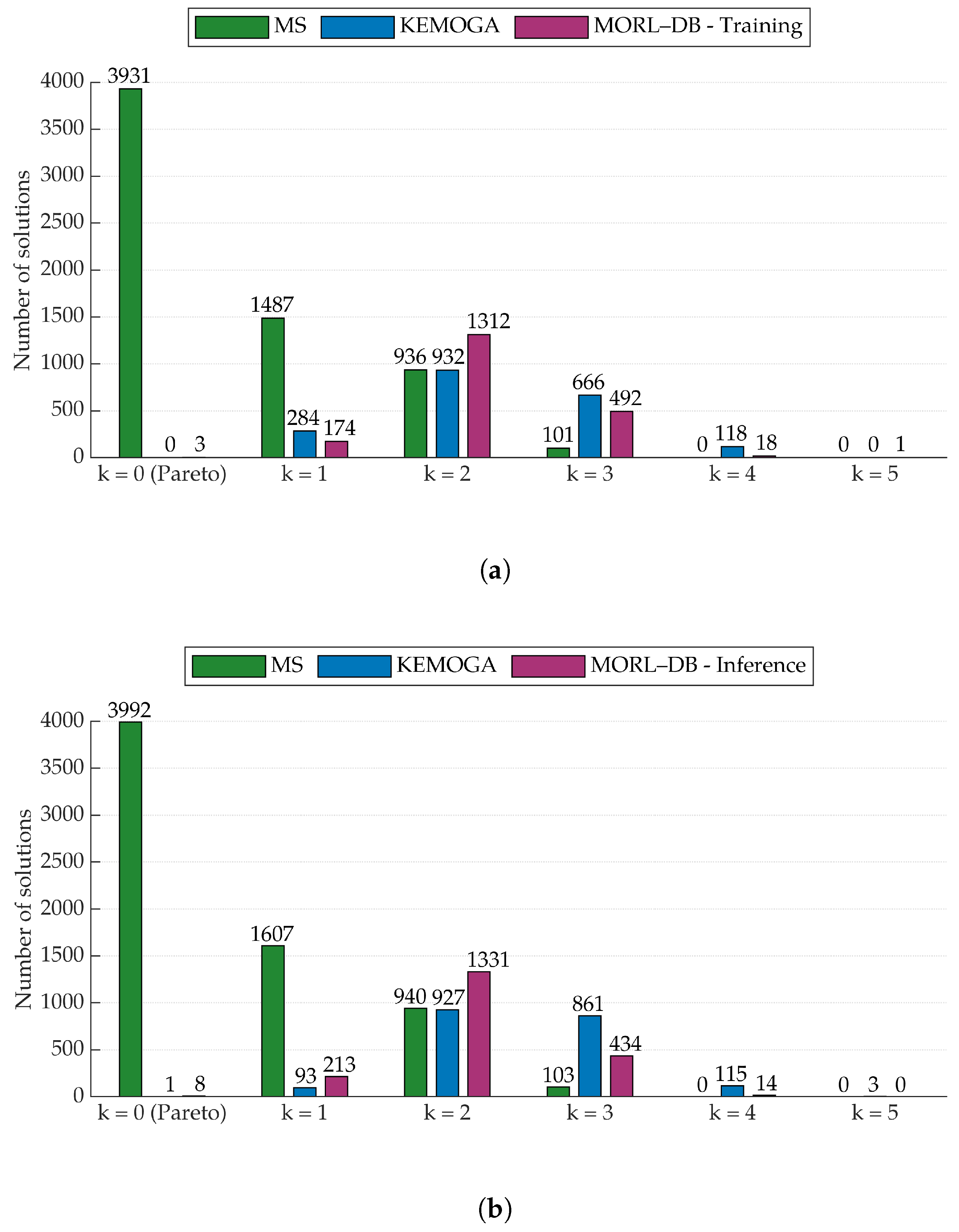 k-optimality). The optimality level of each solution is computed relative to the combined solution sets of all three methods. This enables an objective comparison of method performance in approximating the Pareto front. Most MS solutions have an optimality level