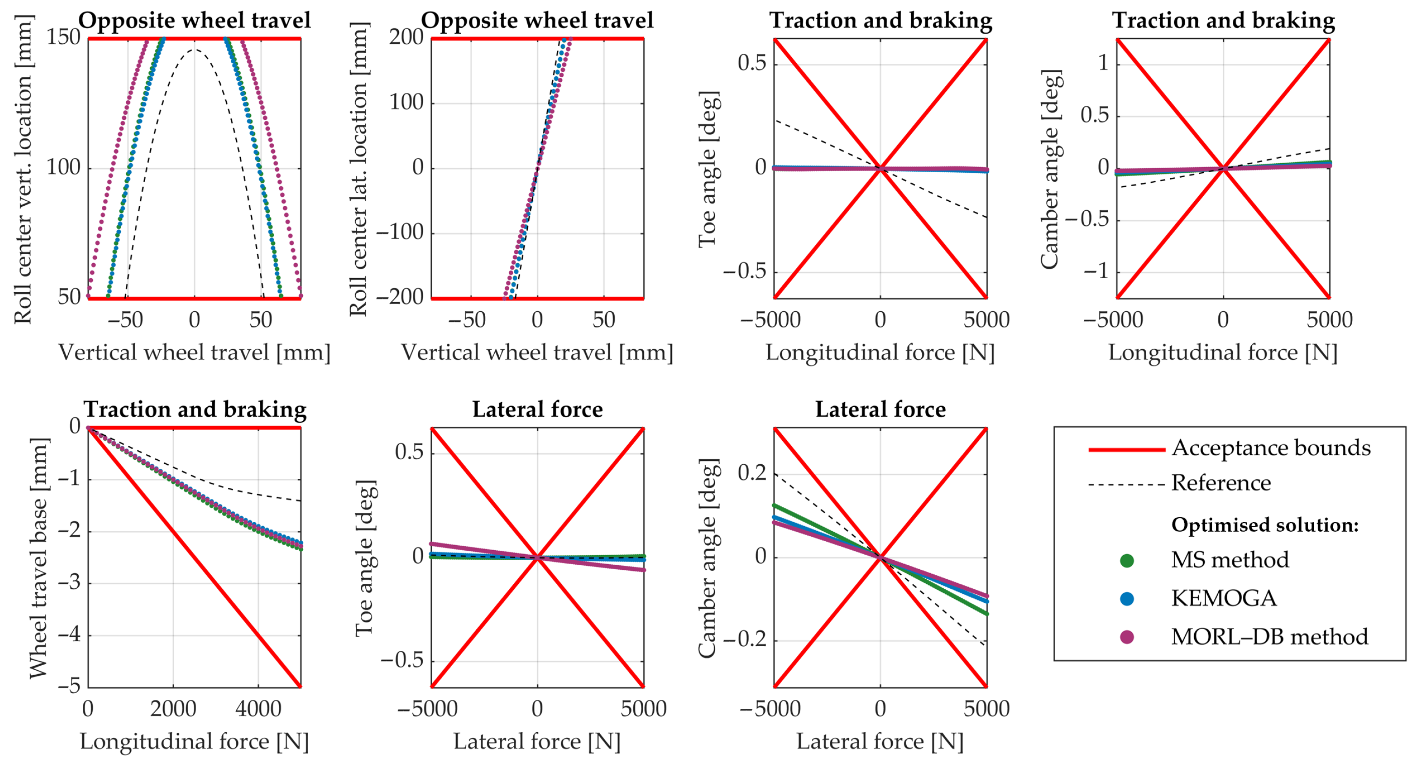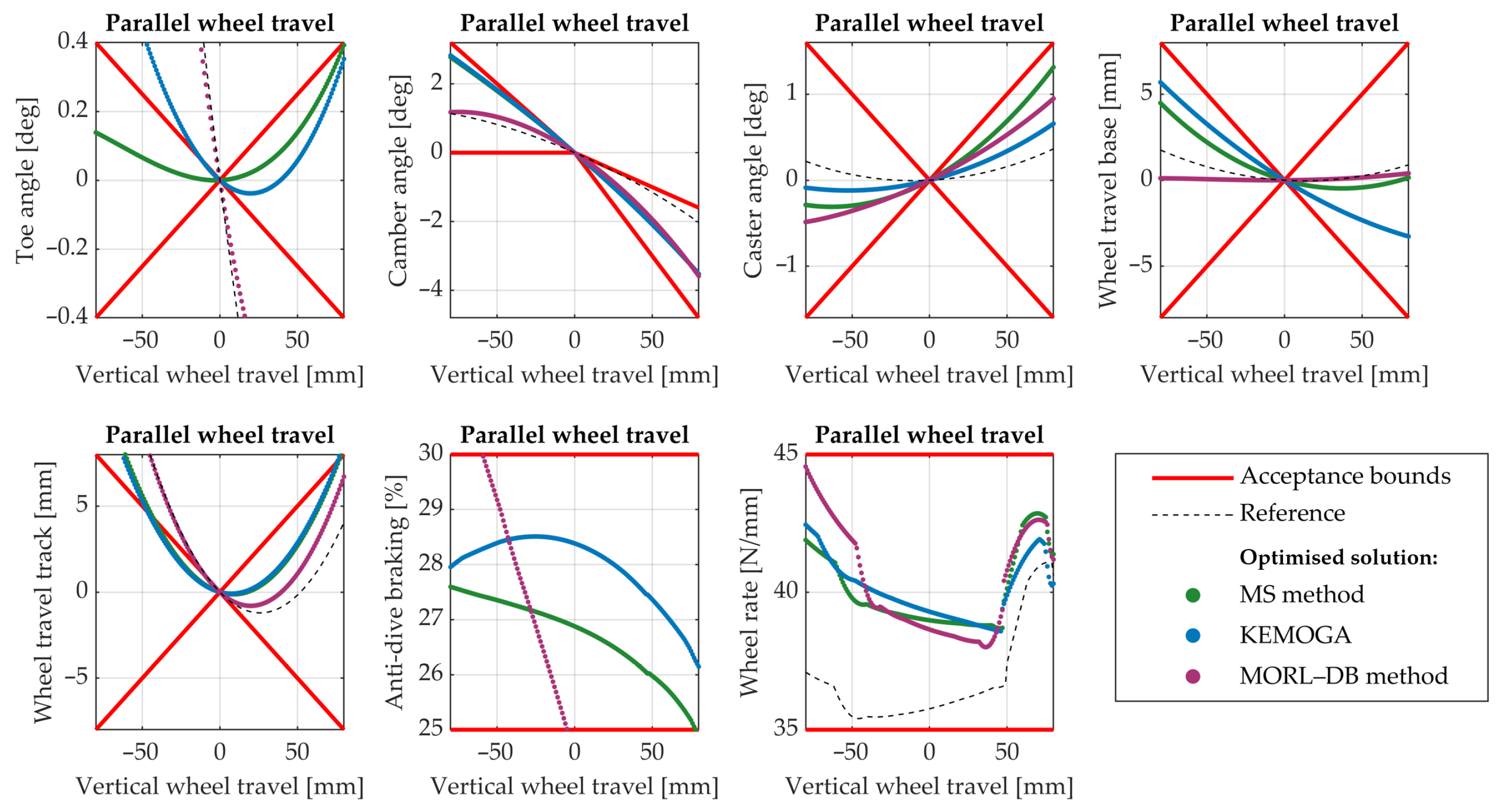 45], who applied the algorithm to the optimisation of the elasto-kinematic behaviour of a MacPherson suspension system. In the present work, the MORL–DB method was applied to the optimal elasto-kinematic design of a double wishbone suspension system, modelled as a multi-body system in the ADAMS Car suite. The optimisation problem involves 30 design variables, including the coordinates of 8 suspension hard points and 6 scaling factors acting on the elastic characteristics of 2 of the suspension’s rubber bushings. These variables are constrained by the available three-dimensional design space for the hard point locations and by upper and lower bounds on the scaling factors. A total of 14 objective functions are considered.