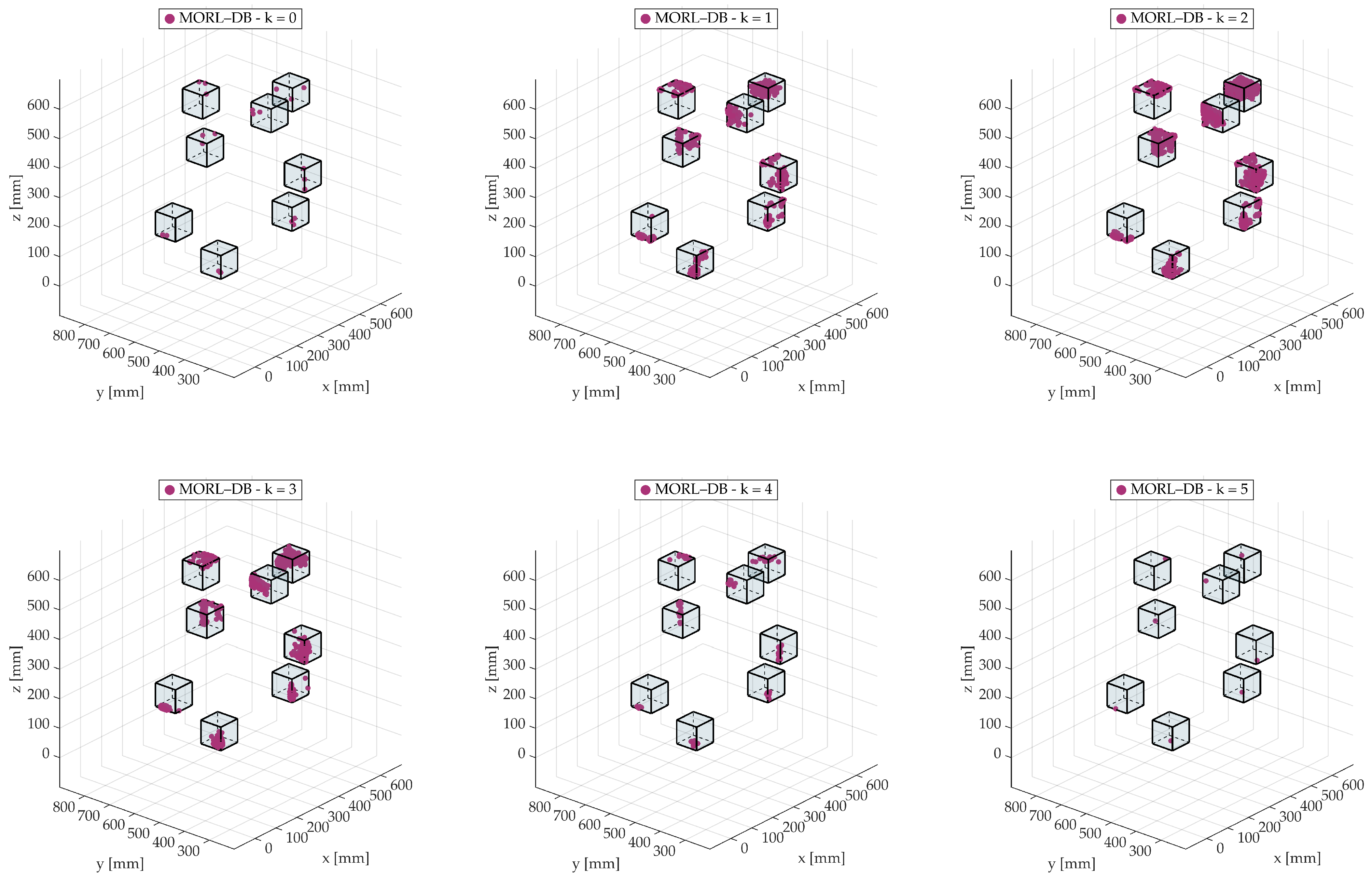 This section presents the results of the multi-objective optimisation of the double wishbone suspension. The outcomes of the MORL–DB method are compared with those of two other approaches: the Moving Spheres (MS, [