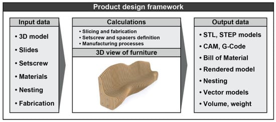 Figure 1 illustrates the framework proposed in this research. The goal was to automate furniture design based on non-conventional geometries, primarily for pieces to be fabricated using wood-related materials, such as plywood. The design engineer’s role was to integrate both the furniture design and fabrication processes, along with the necessary programming skills, to automate the entire workflow. In this system, the user can input an unusual geometry along with other fabrication parameters, such as the number of slices, slice thickness, setscrew and spacer properties, and default values for nesting and manufacturing processes. A series of calculations then results in a complete furniture design based on slicing fabrication principles, with all product details displayed on the screen. The system generates a set of outputs supporting the technical aspects of fabrication, including computer-aided manufacturing (CAM) code, nesting, bill of materials, rendering, and prototyping files. Rhino 3D™ Version 7 and its visual programming language, Grasshopper 3D™, were used to facilitate and automate the entire process. This design framework is tailored to wooden furniture products and can be adapted to develop a range of specialized applications.