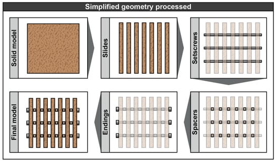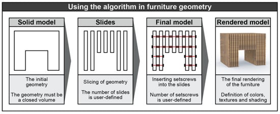 Figure 3 illustrates how the automated furniture design platform operates when a simplified geometry is introduced. The system automatically selects the side of the volume that is perpendicular to its longest length (the initial geometry can also be sliced based on a user-selected plane, if needed). Next, setscrews are inserted automatically, though the designer can modify them if necessary. Spacers are used to fill the gaps between the slices, and finally, the end pieces are designed and positioned automatically.