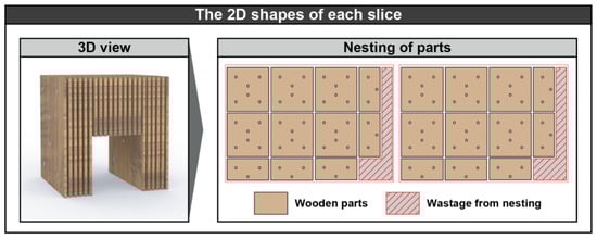 With an aim to support the minimum amount of wooden material used, a nesting feature has been introduced. The present study used a free, open-source Grasshopper 3DTM plugin called OpenNestTM. The algorithm automatically derived the nesting position of all parts of the furniture, when the dimension of the plywood sheet was selected. The user could introduce a variety of plywood sheet dimensions that are available for use in industry, while at the same time, the texture properties were applied (Figure 5).