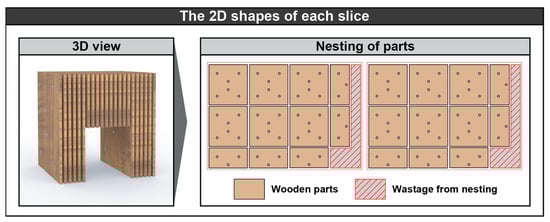 - Stage D (nesting, BOM and export final model, G-Code, set materials and render): The slices are converted from 3D to 2D format and positioned on the plane for the application of the nesting method. The 2D format of the slices is a vector-based geometry on which the G-Code required for the fabrication is created. In addition to the G-Code, a series of exported data is supported by the algorithm, such as 3D CAD models, nesting information, bill of materials (BOM), and export of the final 3D model. Finally, the materials and textures that have been defined from the beginning by the user are applied to create photorealistic renders.