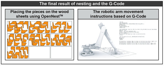 In addition to the nesting feature, the algorithm also supports the calculation of the appropriate coordinates and sizes for the parts, with added functionality to export the required G-code for CNC machining of the wooden components. Additional information is needed on the machinery used in the cutting process, including the equipment manufacturer, digital controller, manufacturing parameters, and tooling. Once this data is inputted, the customized machine program is automatically generated and saved as a text file, ready for use with the available machinery.
