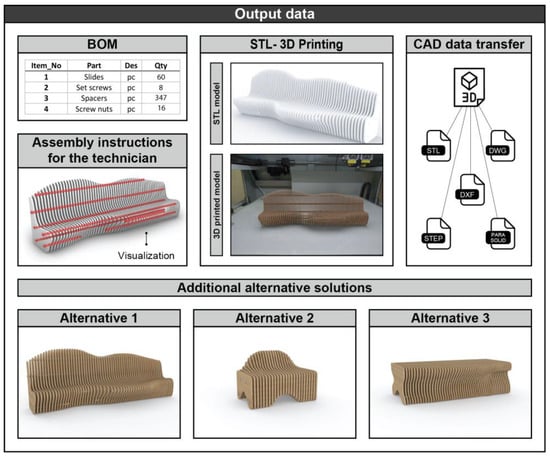 The furniture design platform also exports additional information, including technical drawings of all components involved. This supports the designer in organizing the machining process and in managing the purchase of all necessary parts. The data can also be used for costing and warehousing purposes. A 3D printing feature has been integrated to produce physical prototypes for evaluating the final furniture design. The 3D-printed models primarily help with visualizing the shape and proportions of the furniture, as well as assessing the proposed esthetic solution early in the design process. The small size of the prototype (limited by the capabilities of the available 3D printer) allows both the designer and the user to review the design at a low manufacturing cost. In this study, a CREABOT™ D600 3D printer was used to create a relatively large prototype measuring 600 mm in length. In the furniture industry, companies use various CAD software tools, leading to strong demand for neutral file formats that can be universally transferred. For this reason, the platform exports parts and assemblies in multiple CAD formats, including DXF, DWG, STL, OBJ, STEP, and Parasolid. This ensures seamless communication across different companies, especially for manufacturing purposes (see Figure 9). Figure 9 also presents visual assembly instructions for technicians, along with two alternative design solutions beyond the main one presented in the study. In all cases, the platform operated successfully and produced the final furniture without issues.