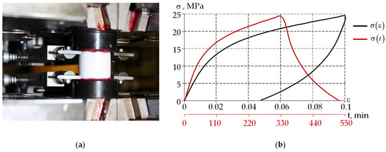To develop a material behavioral model, a series of experiments was initially conducted under homogeneous deformation conditions using cylindrical samples measuring 20 × 20 mm. Testing was performed with a Zwick Z100SN5A material testing machine (Zwick Roell AG, Ulm, Germany) and a Multisens extensometer (Zwick Roell AG, Ulm, Germany). The experimental studies were carried out at the Ural Branch of the Russian Academy of Sciences (ICMM UB RAS, Perm, Russia), under the supervision of Dr. A.A. Adamov. The maximum deformation level for the samples was set at 10%, based on the estimated maximum deformation of the bearing’s antifriction interlayer. This limit represents the maximum allowable level for applying small deformation theory. A multi-stage testing program was implemented up to the 10% strain level, including relaxation, unloading, and recovery phases. The traverse movement speed was 3 mm/min. All experimental studies were conducted at room temperature.