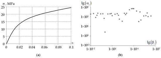 In the second approximation, a viscoelastic model for a Maxwell body was constructed using the Prony series (Figure 3b). The mathematical model was previously described in [55] and is based on the results of a series of experimental studies under uniaxial stress state (USS) conditions.