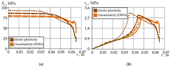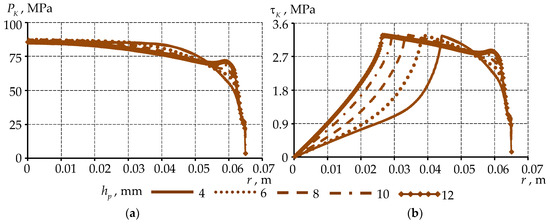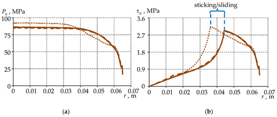 The pattern of the contact pressure and contact tangential stress distribution on , obtained by modeling different types of conjugation on , is shown in Figure 7.