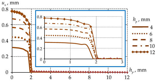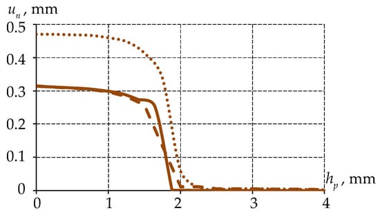 Plastic flow of the material is observed near the protrusion of the antifriction interlayer. The deformation of the interlayer is overestimated compared to that of the actual structure, due to the fact that the elastic–plastic model does not account for material relaxation. The influence of the element connection pattern on the normal displacements of the antifriction interlayer’s end face is shown in Figure 8.