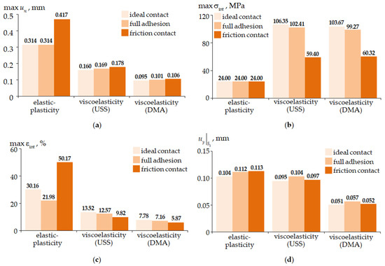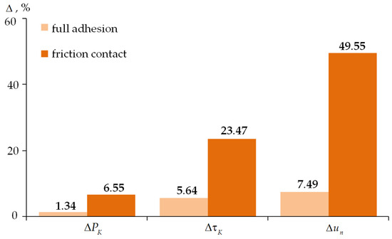 The greatest differences between the solutions are observed in the normal displacement parameter. The difference between frictional contact and ideal contact is approximately 50%, while the difference with full adhesion does not exceed 7.5%. As expected, the smallest differences occur in contact pressure, which is the least sensitive to variations in the numerical implementation parameters. Nevertheless, the difference between frictional contact and ideal contact still exceeds 6.5%. Contact shear stress is more sensitive to contact settings: the difference between full adhesion and ideal contact is 5.64%, whereas for frictional contact, it reaches 23.47%.
