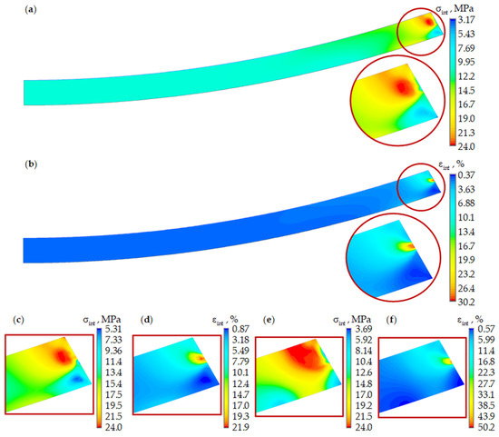 The maximum levels of stress and strain are observed near the edge of the antifriction interlayer, in the protrusion area. The maximum strain level exceeds 10%, and the stress level reaches the peak value from the material’s deformation curve . This is attributed to limitations of the current material model. The maximum area is observed during frictional contact . This occurs because, in this formulation, the antifriction interlayer material undergoes greater deformation due to the possibility of sliding along the contact surfaces. The maximum intensity of deformations is observed near the collar of the spherical cutout of the lower steel plate, where a concentrator forms. To improve accuracy, the material behavioral model should be refined to account for relaxation effects. Implementing full adhesion allows for a more accurate representation of the stress–strain distribution, as it avoids inconsistencies in stress and strain fields between the mating surfaces of the antifriction layer and the bottom plate. The minimum levels of stress and deformation parameters are observed with full adhesion , which demonstrates the effectiveness of processing the contact surface of the lower steel plate using the “torn thread” method.