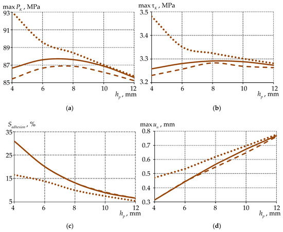 In the second stage of this study, an assessment was made of the effect of the antifriction interlayer thickness at a constant protrusion and the different patterns of the coupling of the elements. The pattern of the distribution of contact pressure and tangential contact stress has small differences when the antifriction interlayer thickness changes. However, an increase in the antifriction interlayer thickness leads to an increase in the maximum level of normal displacement on the surface of the protrusion, which is also confirmed by the results obtained when changing the pattern of the interface. This effect is associated with a decrease in the surface area in the state of full adhesion.