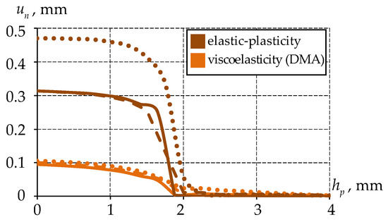 The maximum displacement of the antifriction interlayer is observed near the sliding surface . Under the standard load during indentation by the spherical balancer, the interlayer undergoes significant deformation. In the protrusion zone of the antifriction interlayer, the material enters a state of plastic flow. This deformation can be more accurately modeled by incorporating viscosity into the material behavioral model. Under frictional contact, the antifriction interlayer material can slip relative to the lower steel plate, resulting in a 49.8% increase in the maximum normal displacement. In contrast, the difference in maximum displacement between ideal contact and full adhesion does not exceed 0.1%. The distribution pattern of displacements along the normal direction at the interlayer’s end face shows only minor differences.