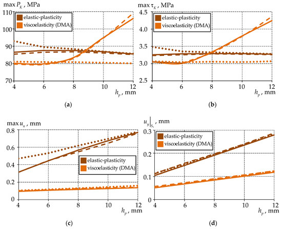 This subsection presents the results of analyzing the influence of the conjugation pattern on the stress–strain state of the antifriction interlayer under constant temperature and pressure. However, factors such as temperature, load magnitude, and load periodicity also have a significant impact on the structure’s behavior. These effects are currently being investigated. An increase in temperature leads to a decrease in contact pressure and an increase in both the sliding contact area and contact penetration. This behavior is attributed to the material’s softening under elevated temperatures, caused by structural and phase transitions. Conversely, when the temperature decreases, the opposite effects are observed—associated with the glass transition of the antifriction interlayer material. Similar trends were confirmed by the DMA experimental results.