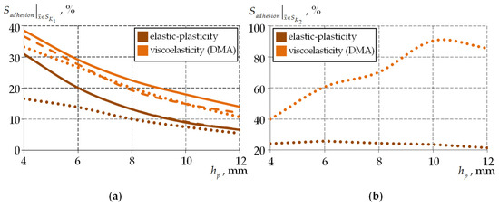 It can be noted that with an increase in the antifriction interlayer thickness with viscoelastic material behavior on the interface surface in the case of frictional contact, an increase in the percentage of the surface area in the state of full adhesion is observed. This means that with sufficiently large antifriction interlayers, additional surface treatment of the interface of the lower steel plate with a “torn thread” interlayer is not required, thus reducing the time and economic costs of manufacturing the structure. The damping properties will also be improved. This study will be useful in analyzing the contact interaction of the bridge bearing elements under the influence of more complex loads, taking into account the time factor, as well as temperature.