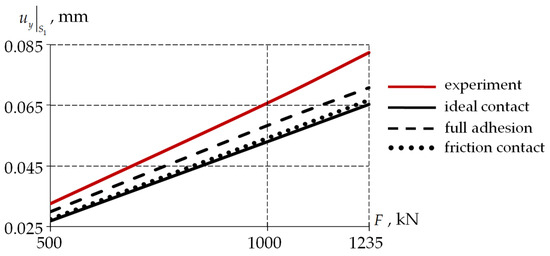 The discrepancy between the results of the numerical simulation and the experiment does not exceed 20% for all variants of the interface of the antifriction interlayer with the lower steel plate of the bearing. The maximum error is observed when modeling an ideal contact . The minimum error of numerical simulation at a nominal load of 1000 kN is observed at full adhesion (~11.37%). This is due to the implementation of the specified type of coupling, due to the equality of the fields of the displacement vector, and due to the components of the stress and strain tensor on the elements’ coupling surfaces. This is not quite “physical” for the considered “steel–polymer” contact. The experiment involved bearings with the character of processing the metal surfaces of the interface of the lower steel plate according to the “torn thread” type, which allows for maximum adhesion to the antifriction interlayer of the material.