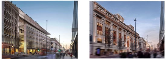 Two images of buildings of the same size in the same urban setting. Images by Pilbrow & Partners (LHS) and Francis Terry and Associates (RHS), used with permission.