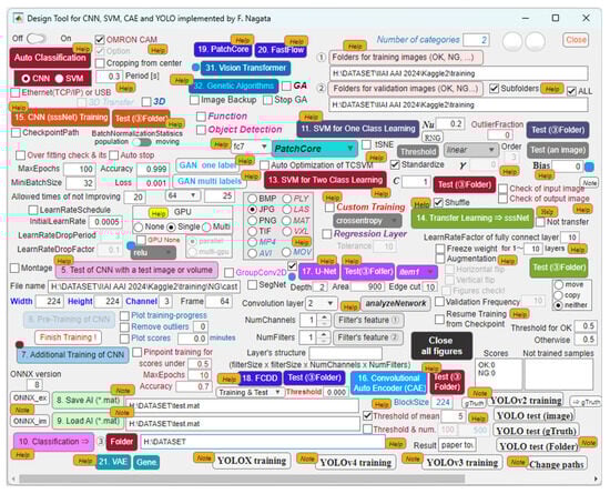 Due to the declining birthrate and aging population, the number of skilled workers in Japan’s manufacturing industry is decreasing, resulting in a serious labor shortage. In product inspection processes, there is an ever-increasing need to automate the task of detecting defective products, which has traditionally been achieved visually by human eyes. In order to solve the issues related to product quality control faced by the manufacturing industry, the authors are developing an application that can easily and effectively design and train a machine learning model that has the same or more ability to identify defective products as skilled inspectors. Figure 1 and Figure 2 show the main and sub dialogs developed on MATLAB R2025a. By using the proposed application, the authors are supporting engineers to build their desired machine learning models for defect detection of industrial products and materials included in images and movies. Available models are convolutional neural network (CNN), convolutional autoencoder (CAE), support vector machine (SVM), you look only once (YOLO) [,], U-Net, segmenting objects by locations (SOLO) [,], mask region-based CNN (Mask R-CNN) [], fully convolutional data description (FCDD) and so on []. In fact, in manufacturing industries, there is a strong need for flexible anomaly detection systems that allow workers to easily cope with all the processes from setting up the environment to operating the system so that we are evaluating and improving the application through trial use and expanding functionality based on feedback from users.