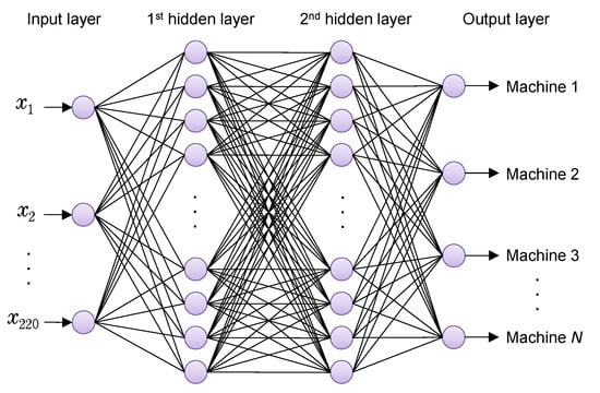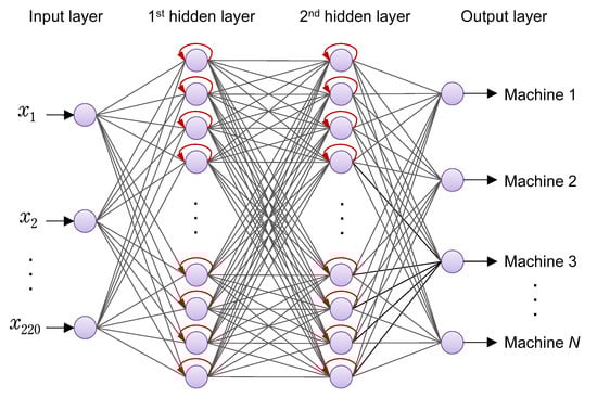 Figure 5 and Figure 6 show four-layered normal neural networks and recurrent neural networks, respectively. The numbers of units in the first and second hidden layers are 100 and 50, respectively. Moreover, Figure 7 shows the structure of a 1D CNN consisting of 11 layers, in which the number N of labels from the output layer is 9 according to the classification task of nine categories.