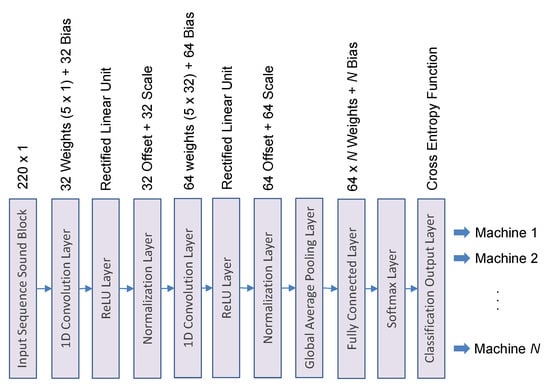After training the three models with the adaptive moment estimation (ADAM) [] and cross entropy loss, they were compared and evaluated through a classification task of test SB data. As a result, mean values of classification accuracies are 87.6%, 88.4%, and 99.5%, respectively. Although there was no significant difference in classification performance between NN and RNN, higher classification performance was obtained with 1D CNN, as shown in Figure 7. As for training time, also, although the NN and RNN required approximately tens of thousands of epochs to converge, the 1D CNN was trained in a shorter time. Actually, the numbers of training weight parameters of NN, RNN, and 1D CNN were 27,609, 52,609, and 11,273, respectively. Table 2 shows each layer’s output activation and the numbers of parameters. Note that the meanings of T and C are time series data and the number of channels, respectively. It is expected from the above results that, in the future, anomaly detection using 1D CNN will be possible by redesigning the final output layer for binary classification, i.e., normal and anomaly, and by training it using normal and anomaly machining sounds accumulated in the target domain.