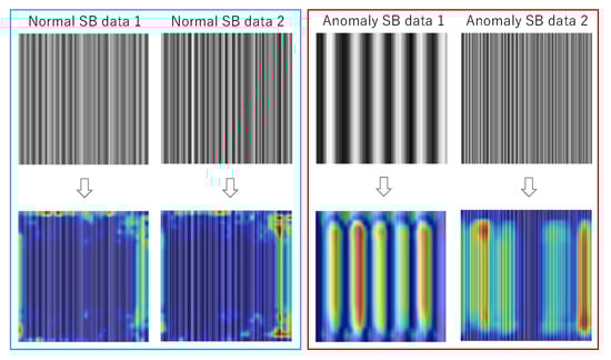 The conversion to a 2D image by Equation (7) may seem to be redundant. However, the input layer’s resolution of FCDD depends on that of the CNN model used as the backbone network. The backbone network works as a feature extractor. The proposed SD-based FCDD model employs VGG19 for the backbone, so that the resolution of training and test images has to be fitted to that of VGG19. That is the reason why feature-mapped images for giving the FCDD are simply created by duplicating one line of SB data.
