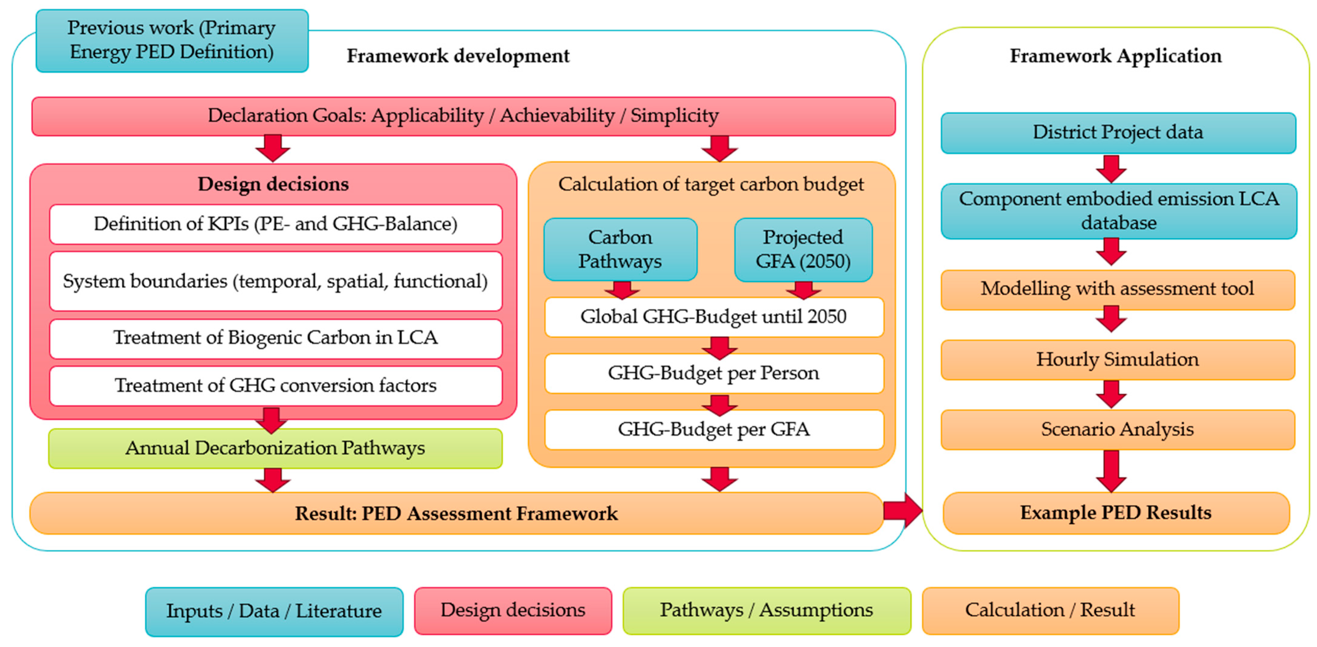 - Two KPIs with targets: (1) cumulative GHG budget to 2050 and (2) annual primary energy balance for declaring PED status (with/without mobility).
