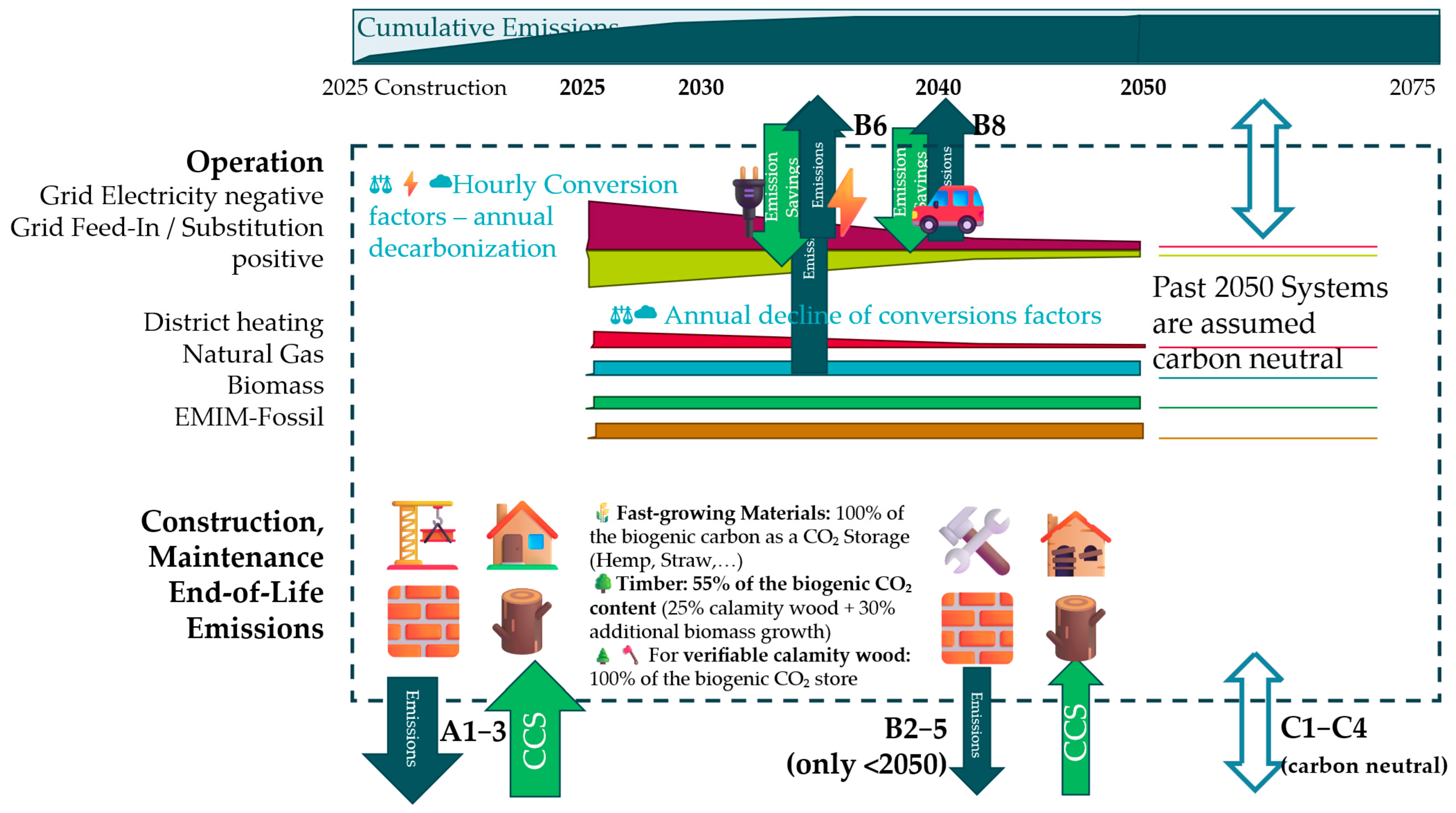 - Temporal differentiation—Emissions are assessed over a 50-year timeframe (2025–2075), with the assumption that climate neutrality is achieved for all services by 2050. As a result, all conversion factors for both operational and embodied energy are assumed to be zero by 2050, reflecting the expected decarbonization of energy carriers and building systems. This approach ensures alignment with long-term climate goals while considering the gradual reduction in emissions over the assessment period.