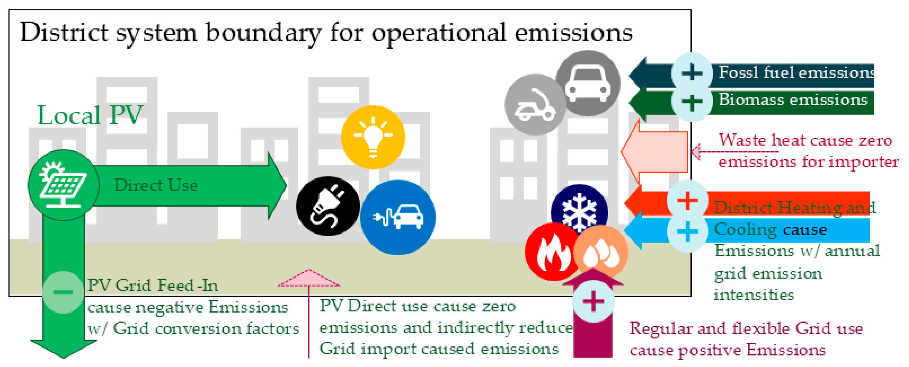 - Integrated and adaptable system boundaries—Assessment boundaries extend beyond individual buildings to the full Positive Energy District (PED) system, covering on-site generation, storage, flexibility, and interconnections with surrounding grids. The framework retains adaptability in data sources, emission factors, and system configurations, allowing regional customization while ensuring methodological comparability.