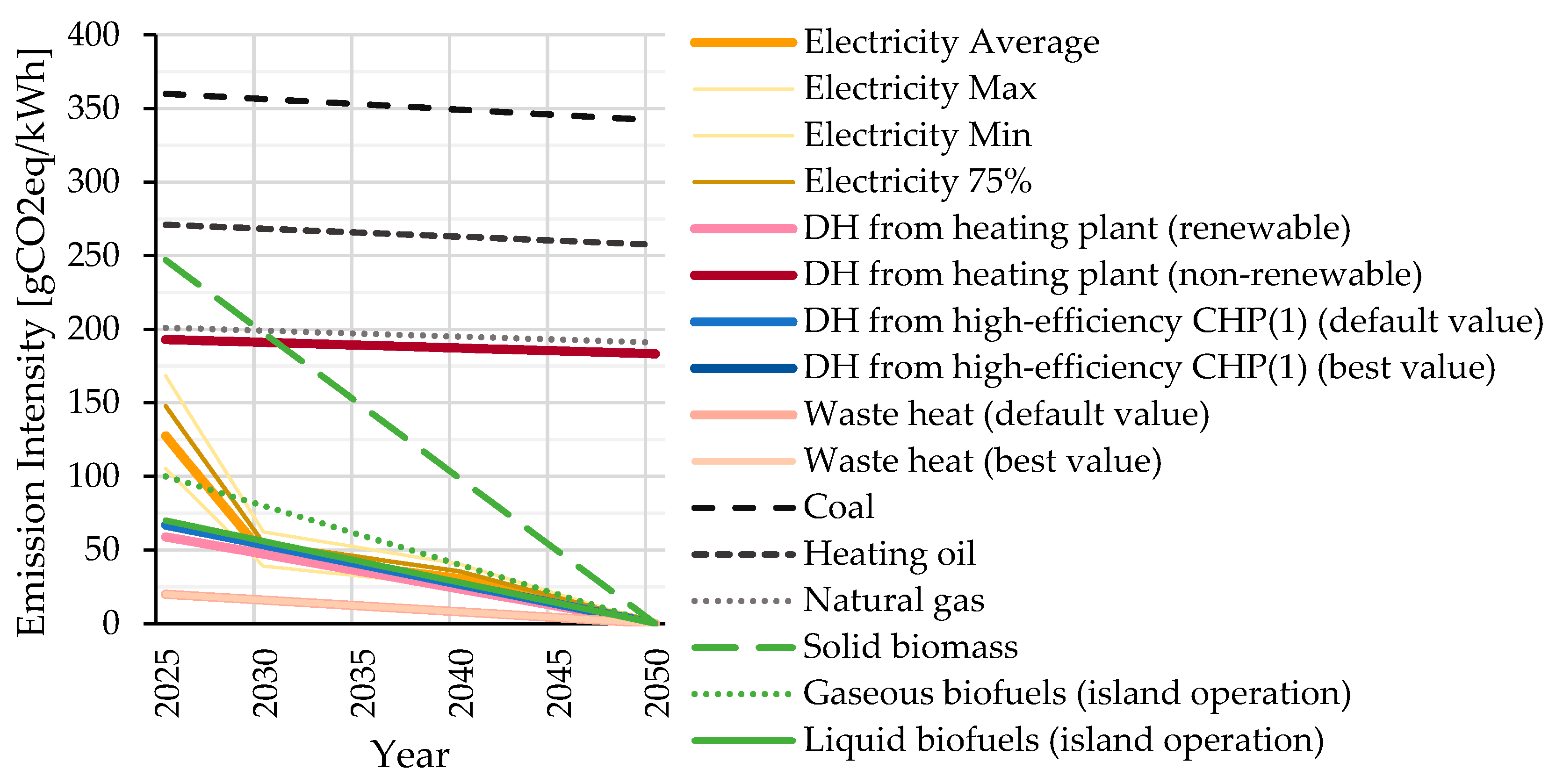 - For biomass and district heating from renewable sources, a separate decarbonization pathway is applied based on sectoral transition strategies, reflecting gradual replacement of fossil inputs with renewable heat sources.